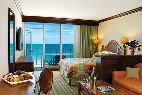 Upgraded rooms feature partial or full ocean views, and suites add balconies or sitting areas.