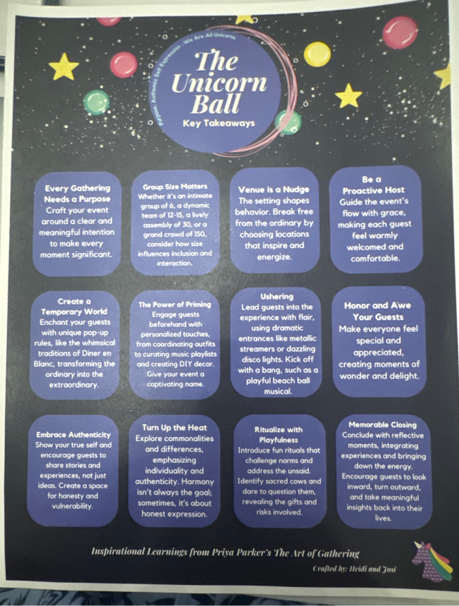 At BoomPop, we take unicorns seriously. Each week, we pass the title of Unicorn to a colleague who exemplifies our core values, celebrating these moments in our culture. The Unicorn Ball at the offsite was a special event, themed around the book The Art of Gathering, which emphasizes creating memorable experiences for guests.